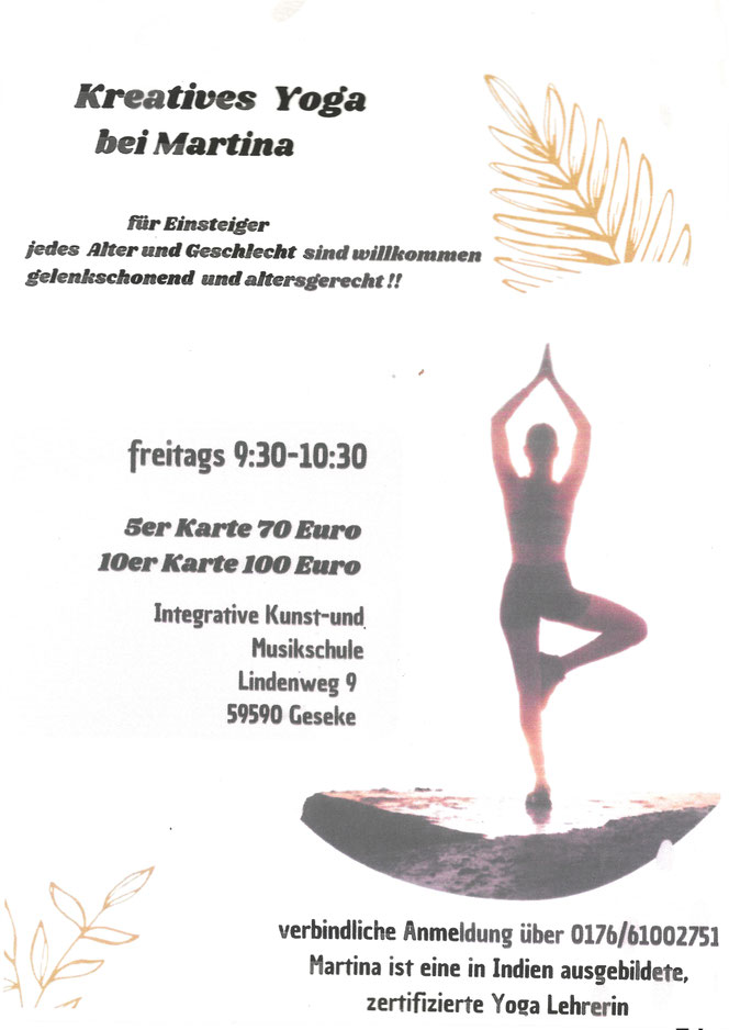 Auf den nächsten Seiten informieren wir Sie über unser Unterrichtsangebot (Klavier, Gitarre, Geige und viele weitere Instrumente, Musische Frühförderung, Malen, Gesang, Yoga usw.).